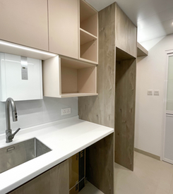 這個單位整體用了灰色作為主調,配上不同的幾何圖案顯得時尚又簡約,與公共房屋一向給人的殘舊印象,截然不同!另外,入牆櫃、地台床等設計 ,成功加大單位空間感及收納空間集美觀與實用於一身!