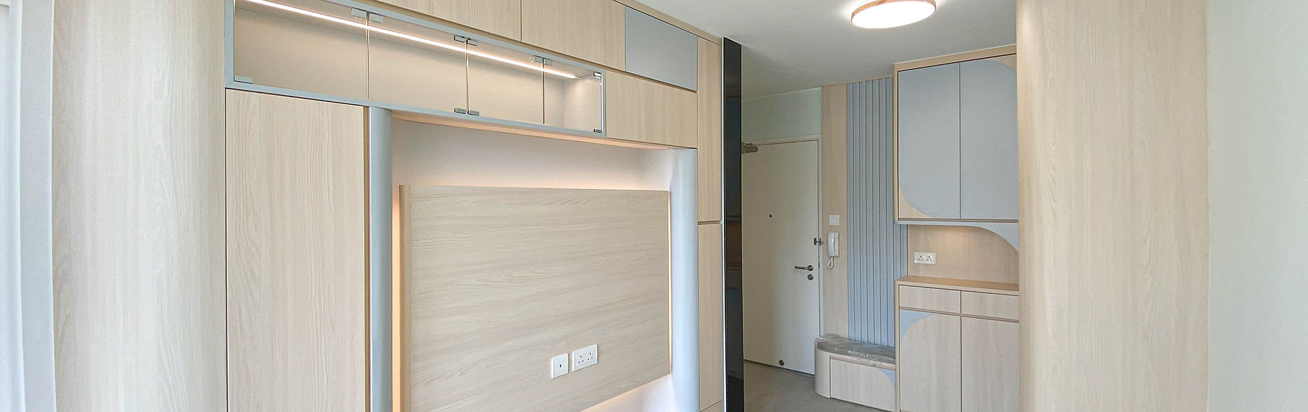 380呎居屋大門口旁傢俬間房|書房兼客房兩用|隱藏床|特色牆連隱藏門|居屋設計 全屋裝修 訂造傢俬|兩房一廳|微輕奢風格|Distinct Design